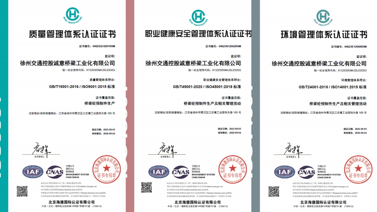 近日,徐州交通控股誠意橋梁工業(yè)化有限公司(以下簡稱冠盛橋梁公司)順利通過了ISO9001質(zhì)量管理體系、ISO14001環(huán)境管理體系以及ISO45001職業(yè)健康安全管理體系的“三體系”認(rèn)證,同時(shí)榮獲了認(rèn)證證…